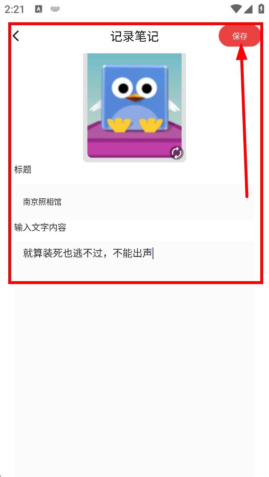 3、在记录笔记编辑页,输入标题和文字内容后,点击保存。