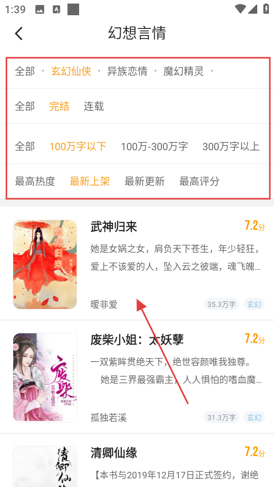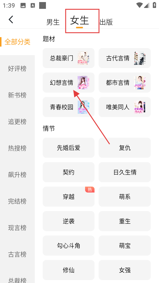 2、在分类筛选页面,选择女生分类下的幻想言情,进入列表页。