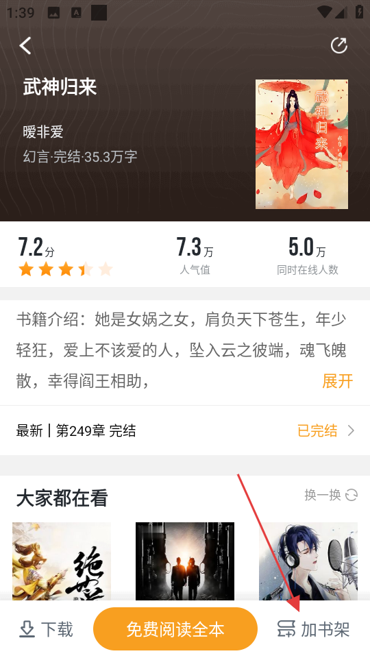 4、在书籍详情页,点击加书架,将书籍添加到书架方便后续阅读。