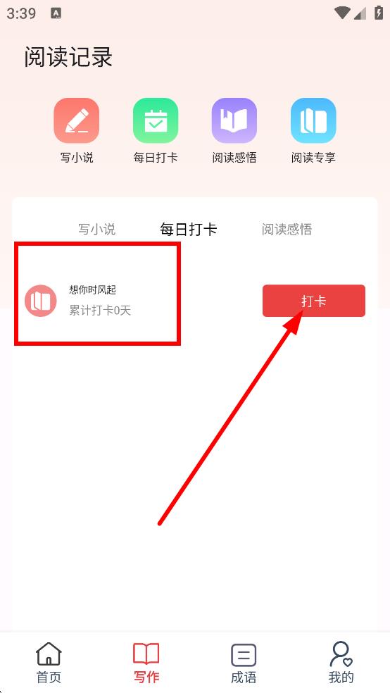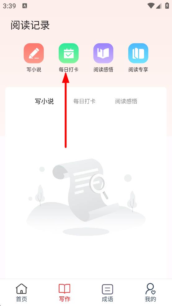 2、在阅读记录页面,点击每日打卡,进入每日打卡编辑页。