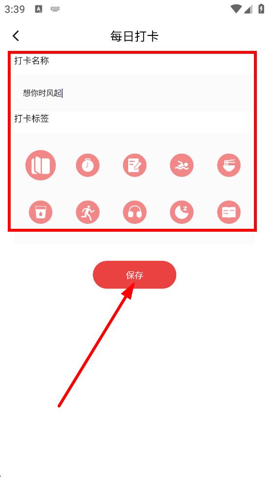 3、在每日打卡编辑页,输入打卡名称并选择打卡标签后,点击保存。