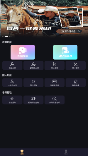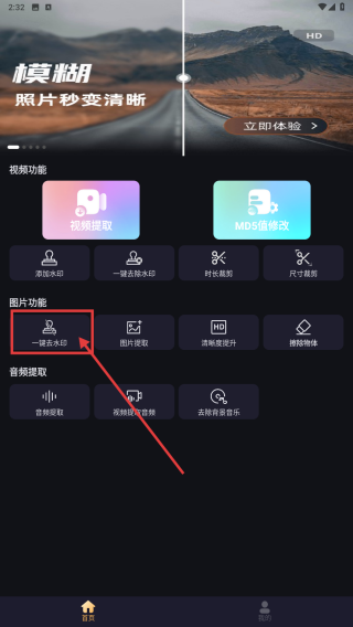 1、打开视频/图片处理类APP,在首页点击一键去水印选项,进入去水印功能页面。