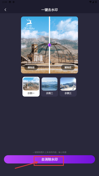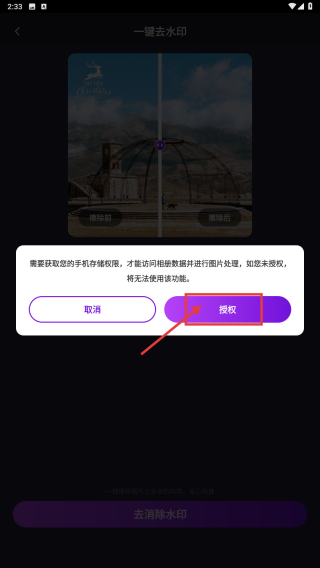 2、在一键去水印页面,点击去消除水印按钮,触发权限获取提示。