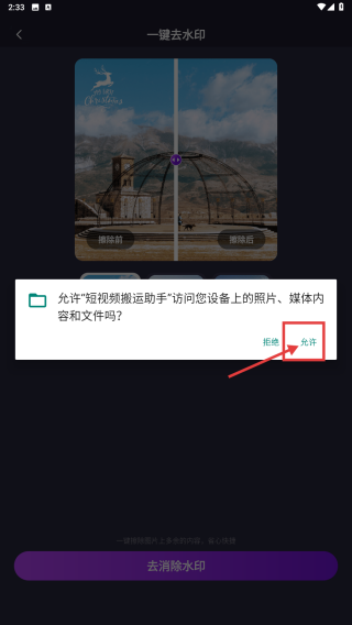 4、在访问设备照片、媒体内容和文件的权限提示中,点击允许,完成权限授予,以便使用去水印功能。