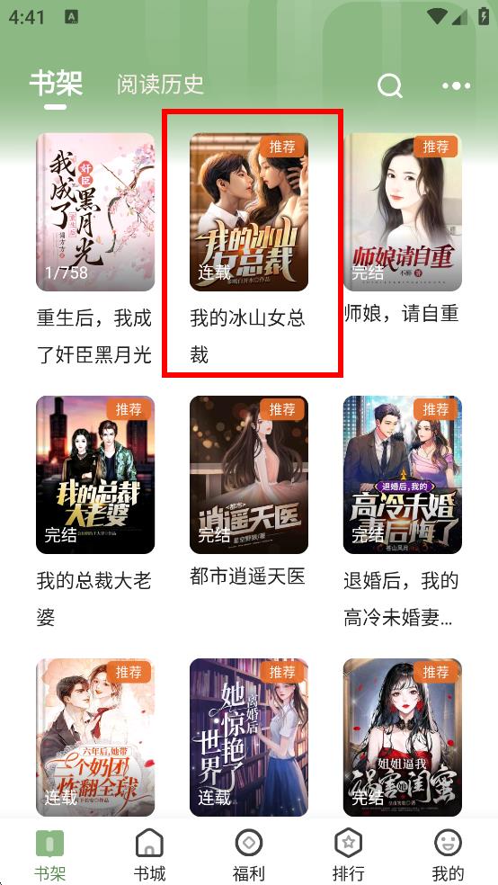 1、在书架页面,点击我的冰山女总裁,进入书籍详情页。