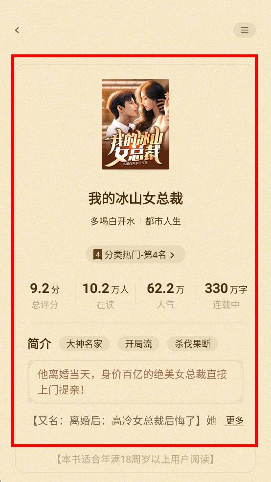2、在我的冰山女总裁查看书籍评分、在读人数等信息。