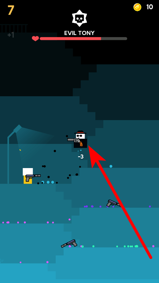 4、当遇到首领的头目邪恶托尼时,集中火力对其进行射击,消耗其血量,成功击败头目,可完成关卡挑战,继续推进游戏。