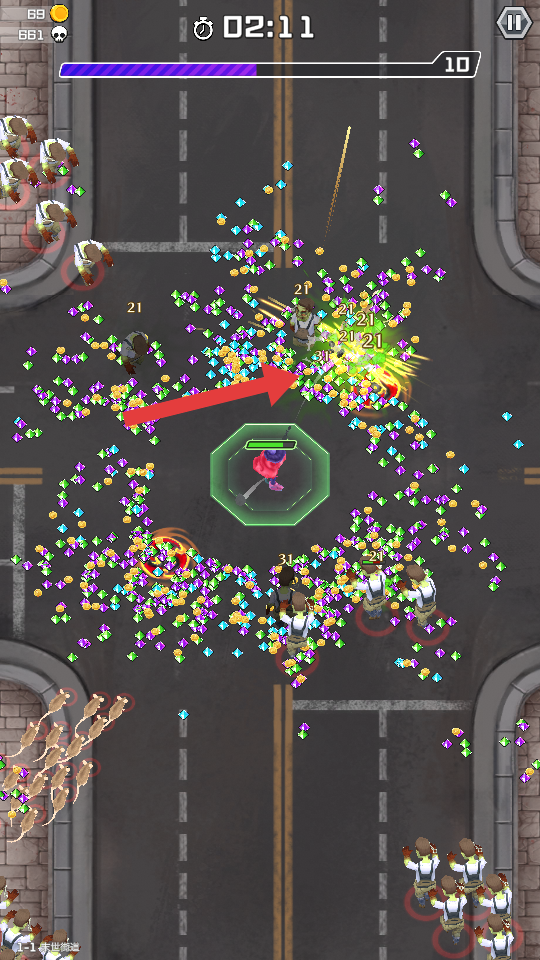 2、道具利用,战斗中会掉落大量彩色道具,这些道具可能是增益buff或资源,要及时靠近收集,提升角色能力或战斗助力。