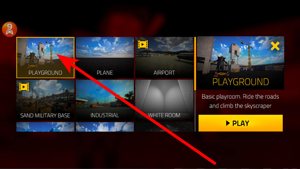 2、进入场景选择界面,会看到多个不同的场景选项,挑选想要体验的场景,比如PLAYGROUND,为后续的军事互动确定场景。