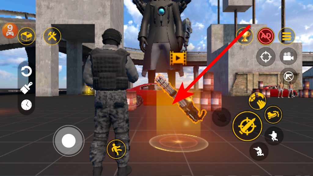 4、进入互动场景后,利用界面上的各类按键,选择并使用武器,与场景中的元素进行互动,体验军事模拟的乐趣,推进游戏进程。