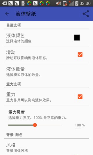 Splash是一款模拟液体的动态壁纸,用到设备的重力感应,可以设置液体颜色,模拟得挺逼真的。它使你的背景更有趣,不断移动手机的方向将影响液体。