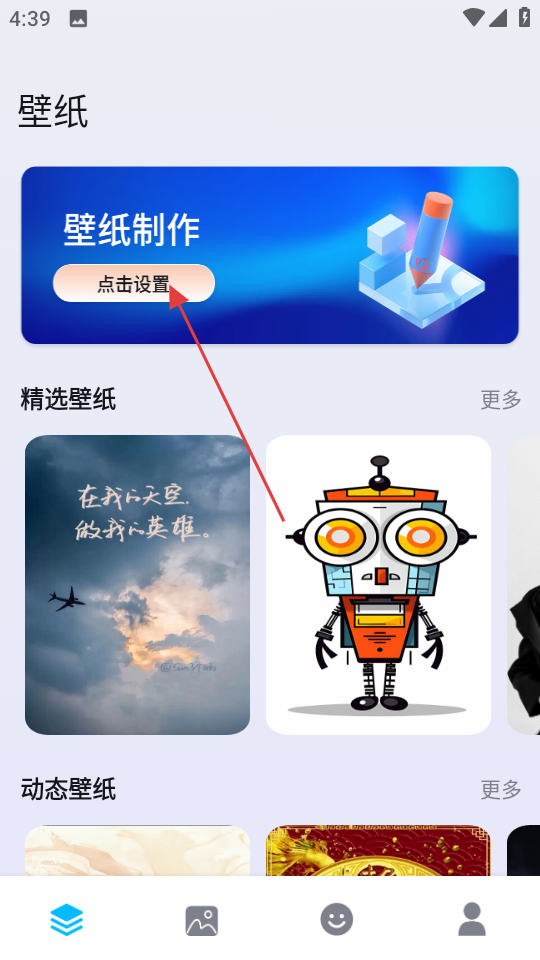 1、在壁纸页面,点击壁纸制作下的点击设置,进入壁纸制作模板选择页面。