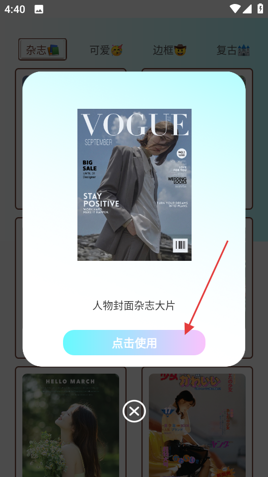 3、在杂志类模板页面,点击心仪的模板,弹出提示框,点击点击使用。