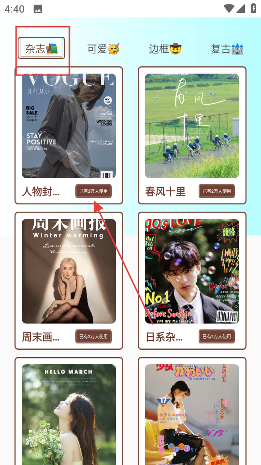 2、在壁纸制作模板选择页面,点击杂志分类,进入杂志类模板页面。