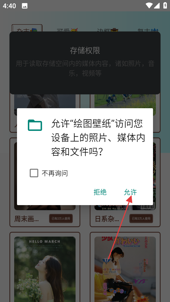 4、在弹出的存储权限询问框中,点击允许,授予权限。