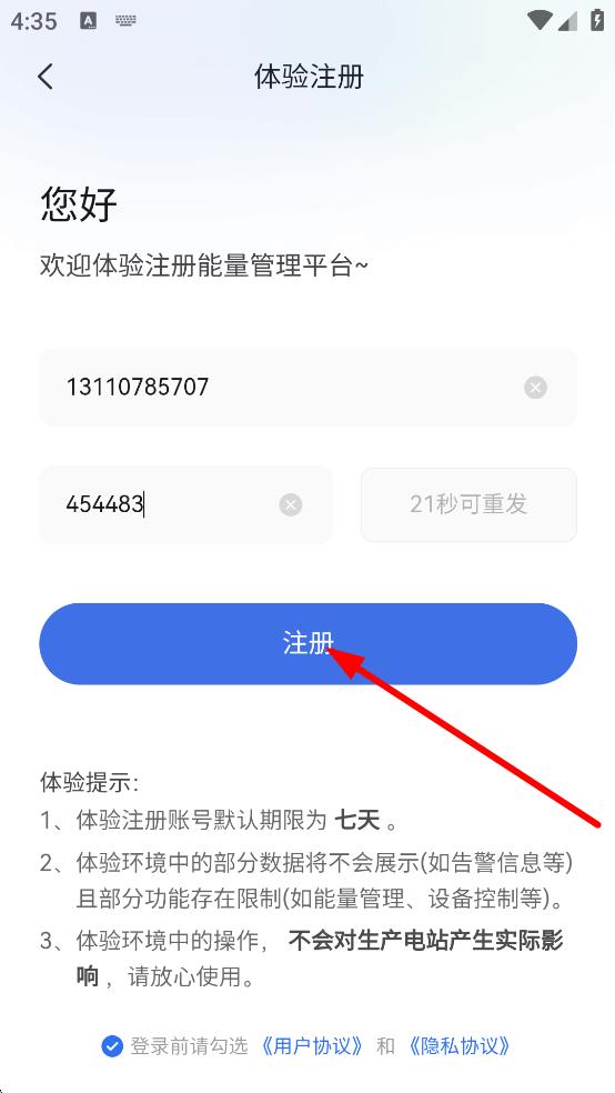 3、输入手机号和验证码后,点击注册,完成体验注册。