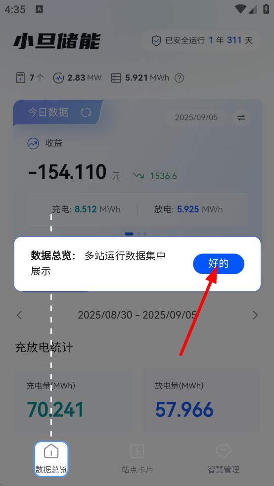 4、注册成功进入小旦储能页面,出现数据总览提示框时,点击好的关闭提示框。