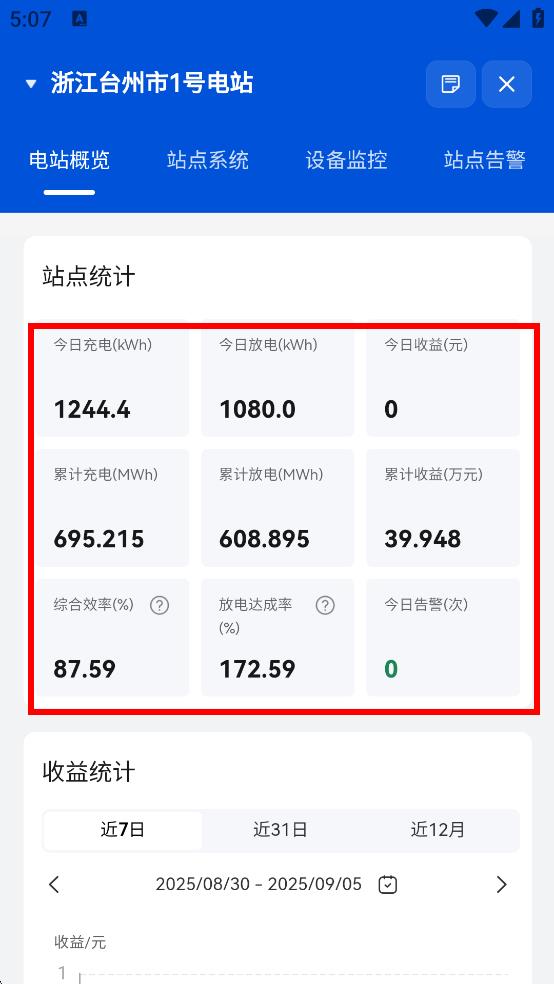 3、在浙江台州市1号电站电站概览页,查看站点统计数据。