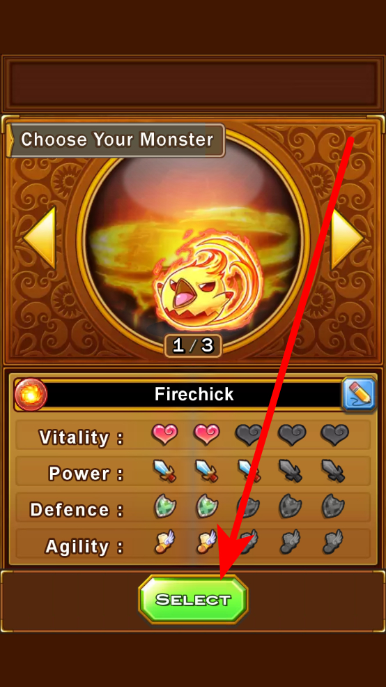2、会看到可供选择的怪物,比如Firechick,查看其活力、力量、防御、敏捷等属性,点击SELECT按钮,选定这只怪物,作为冒险伙伴。