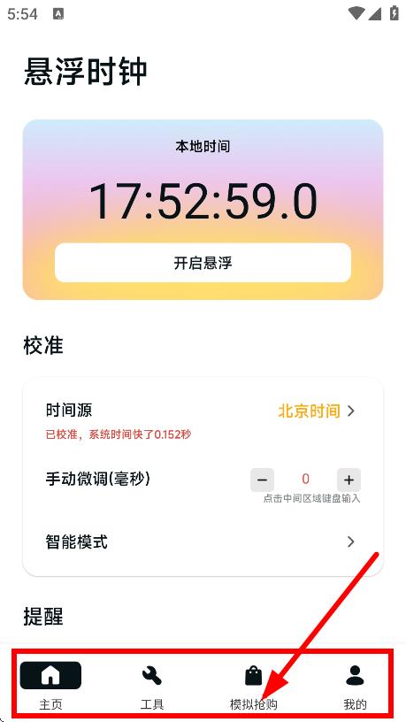 1、在悬浮时钟页面,点击底部模拟抢购,进入模拟抢购页面。