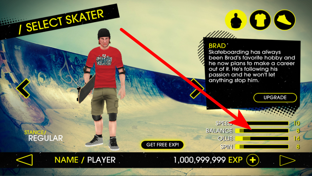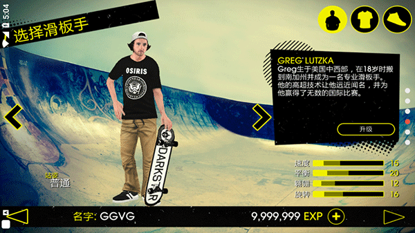 1、进入游戏,仔细查看不同角色的属性如速度平衡跳跃旋转等能力,像BRAD根据自身喜好与操作风格,选择合适的滑板角色,为滑板竞技做准备。