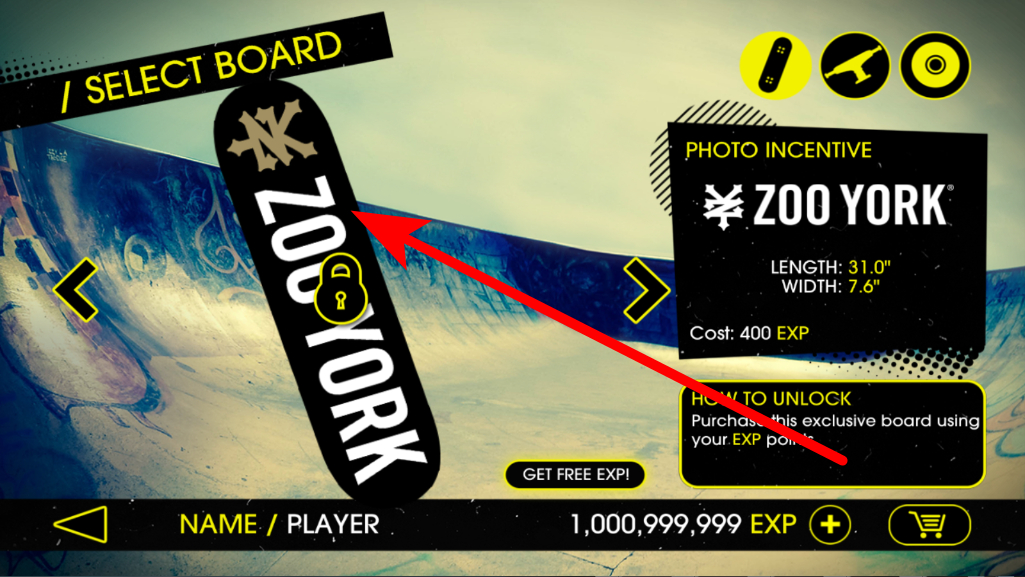 2、滑板挑选界面,这里有不同品牌与规格的滑板,部分滑板需用经验值解锁,如ZOOYORK滑板,按要求获取足够经验值解锁并选用心仪滑板。