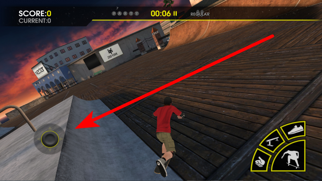 4、滑板场景后,通过屏幕上的控制按钮,如方向控制与动作按钮,操控角色在场景中滑行,做出各种酷炫滑板动作,获取分数,完成竞技挑战。