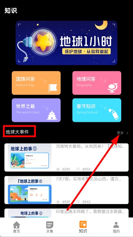 2、在知识页面,找到地球大事件板块,点击其右侧的更多。