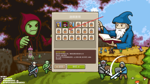 1、点击选择首领界面,选择已解锁的首领,不同首领有不同技能,如提示中提到的增加经验获取、提升法术研究概率等,选好后点击继续。