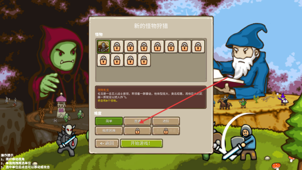3、来到新的怪物狩猎界面,选择要狩猎的怪物,可先从简单难度入手,选好难度点击开始游戏。