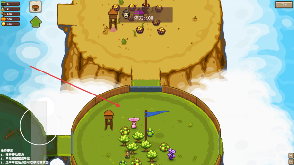 4、通过左下角虚拟摇杆移动角色,探索地图,收集资源,留意屏幕上方体力等信息,逐步建立和发展自己的势力。