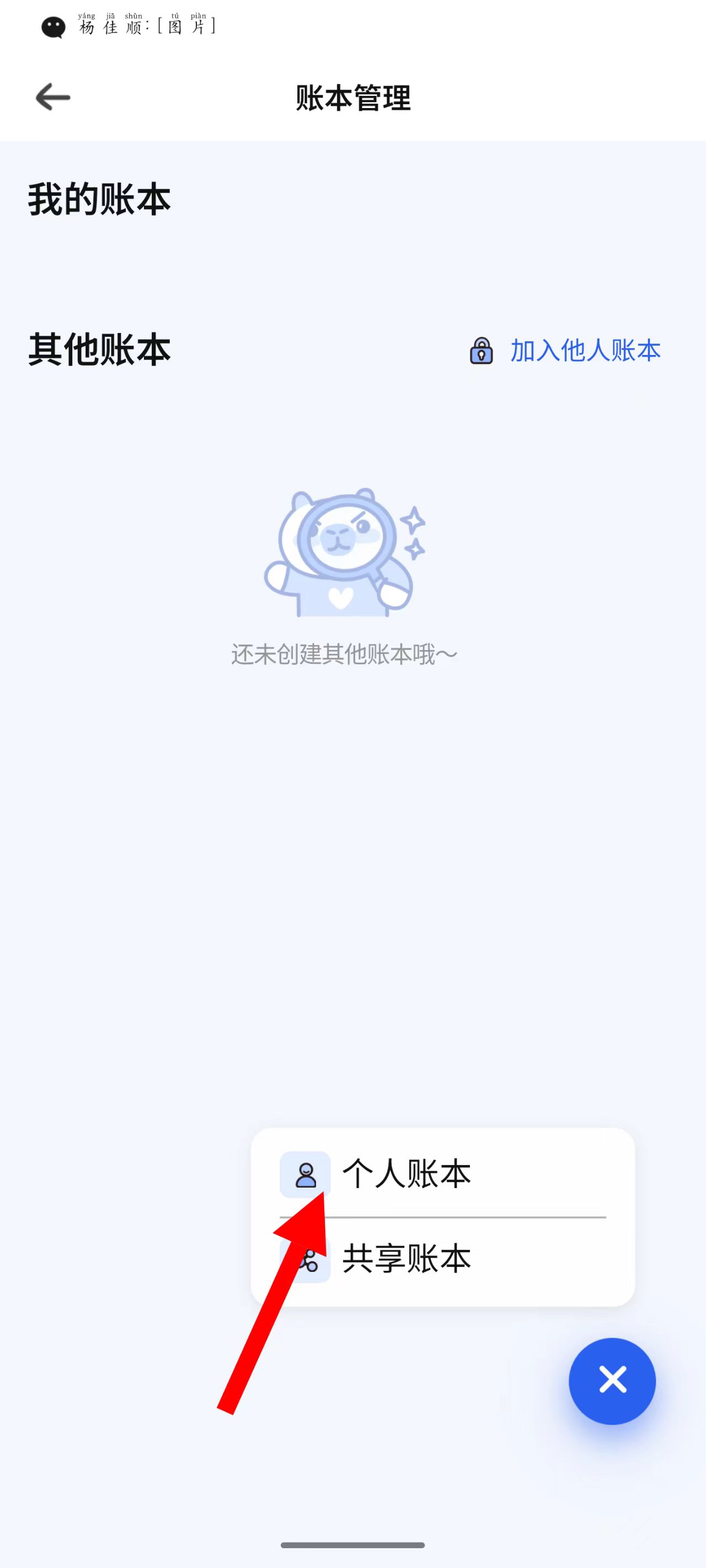 3、在弹出的选项中,点击个人账本选项,进入添加个人账本页面。