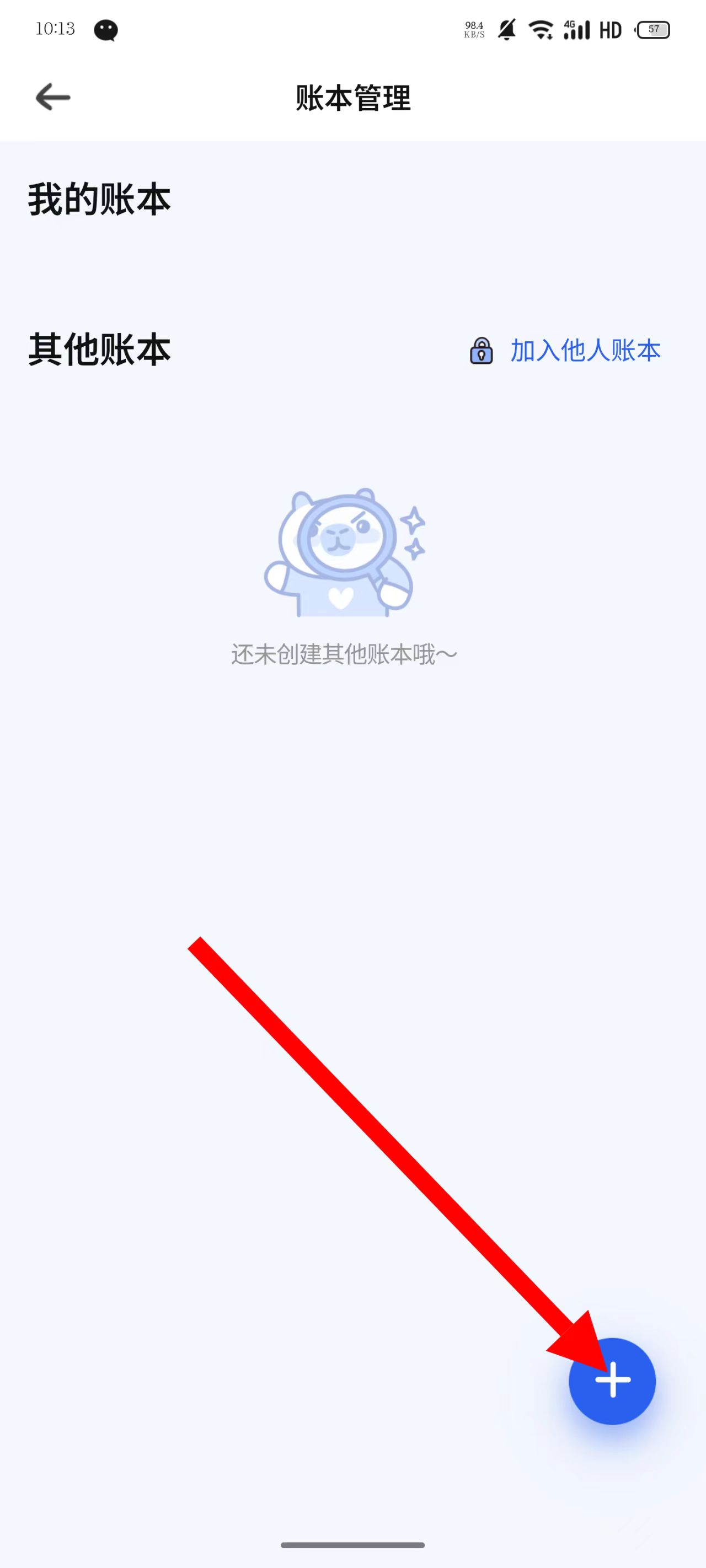 2、进入账本管理页面后,点击右下角的蓝色+按钮。