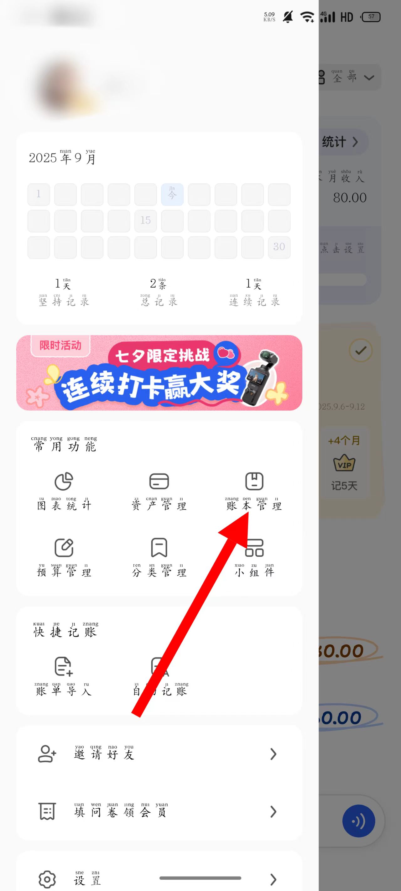1、打开咔皮记账APP,在首页点击账本管理选项。