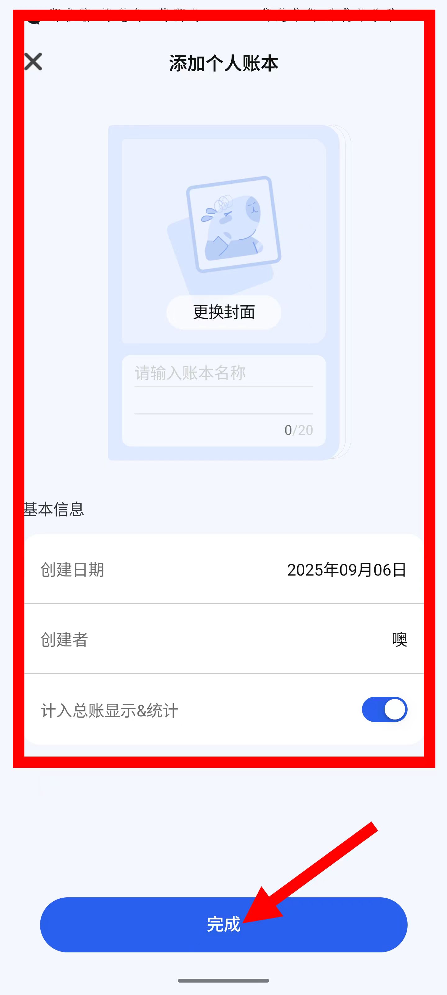 4、可更换封面、输入账本名称等,设置完成后点击底部的完成按钮。