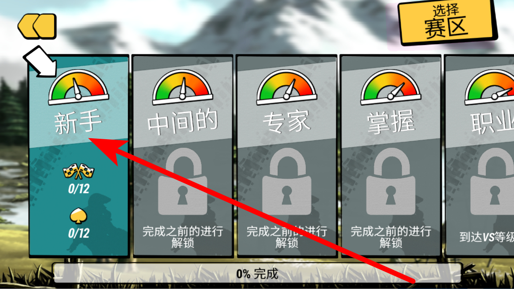 1、进入游戏,可选择赛区,初始可从新手赛区开始,完成新手赛区的赛事,能逐步解锁中间的、专家等更高难度的赛区,开启不同难度的竞速挑战。