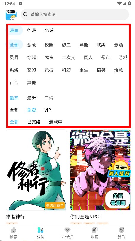 1、资源覆盖广且分类精细:涵盖全网热门漫画与小说,不仅有主流类型,还包含小众题材,按“类型、排行、新品、专题”多维度分类,精准找到偏好内容。