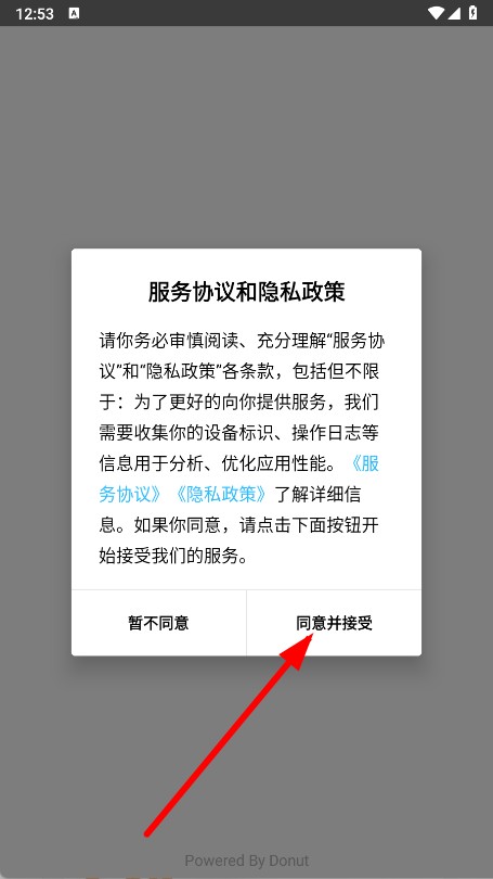 1、打开屯屯漫,在弹出的页面点击同意并接受。