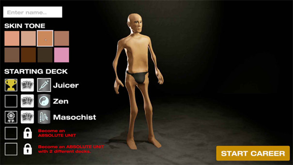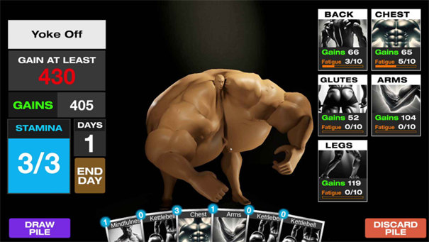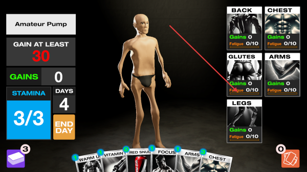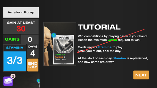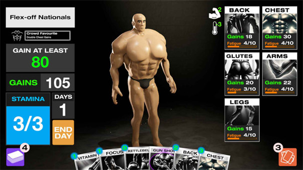 2、根据教程提示,出牌来赢得比赛,达成最低增肌要求,出牌需消耗耐力值,耐力耗尽点击结束当天训练。