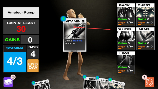 4、合理使用手中卡牌,如VITAMINB卡,按说明获取相应效果,比如增加明天的耐力值,规划出牌策略以高效完成增肌目标。