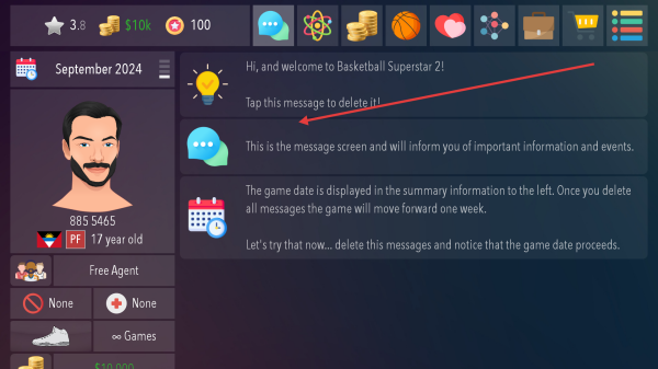 2、进入游戏,查看消息界面提示,点击消息将其删除,游戏日期会向前推进一周,借此熟悉游戏时间推进机制。