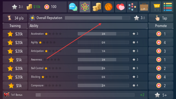3、进入训练界面,查看各项能力值,如加速能力等,花费资金进行训练提升能力,同时留意整体声誉变化。