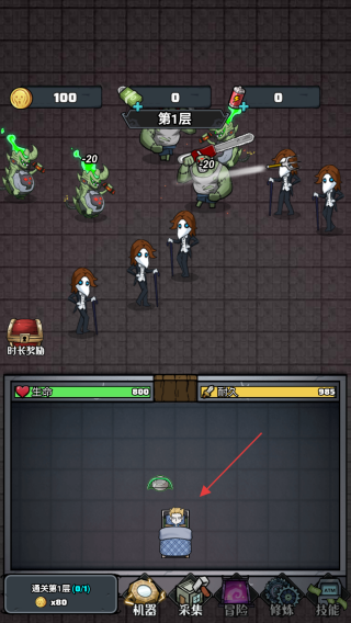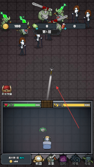 1、游戏开始查看界面上方的金币数量100和层数第1层,利用武器抵御靠近的怪物。