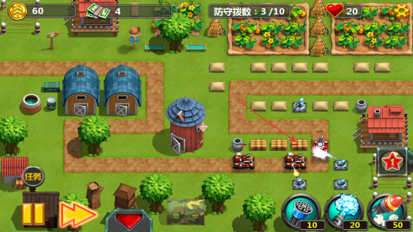 1、查看防守拨数3/10,利用金币和钞票在敌人路线布置防御塔,抵御敌人进攻。