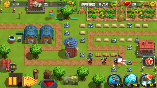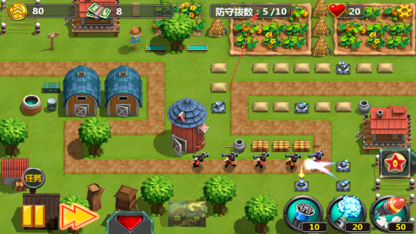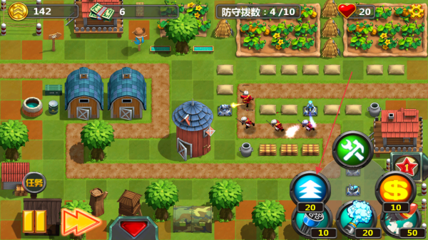 3、到防守拨数5/10,升级防御塔提升战力,继续在路线关键处布防,阻挡敌人。