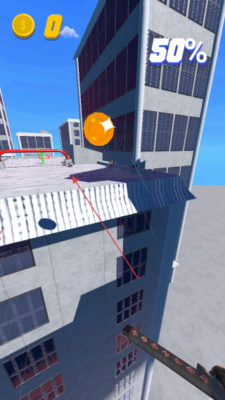 3、看到红色坡道标识,控制角色跳跃或加速通过,继续在城市屋顶场景中前进。