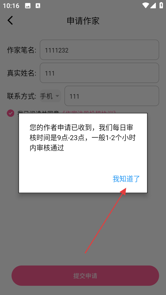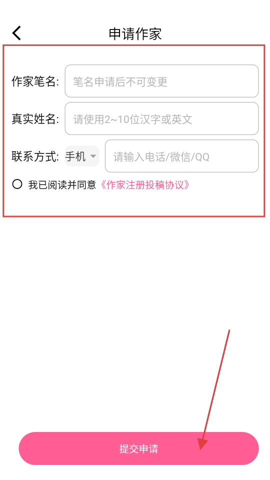 3、在申请作家页面,填写信息,勾选协议后,点击提交申请。