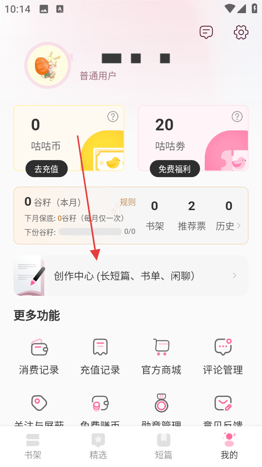 2、在个人页面,点击创作中心,进入申请作家页面。