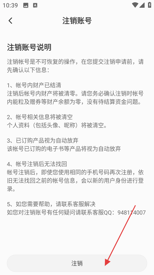 4、在注销账号说明页面,点击注销,完成账号注销操作。