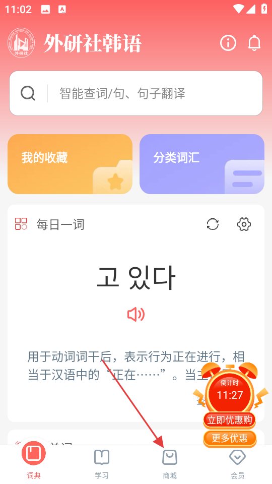 1、在词典页面,点击商城,进入商城页面。
